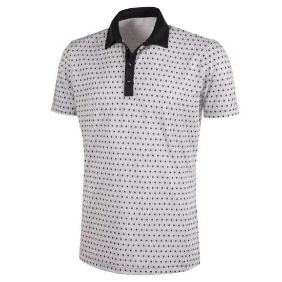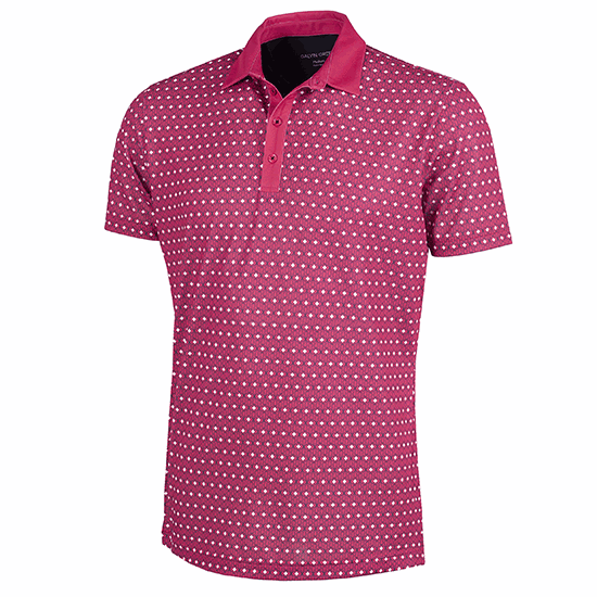 Short sleeve golf shirt with exceptionally good breathability. Design pattern that flirts with argyle along with a solid coloured collar and placket.